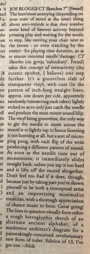 Years later, while putting together a book chapter about anti-records, the Bloggs name came up again in the form of CT Sketches, a clear record with irregular hand-etched grooves — that is, if you can call them grooves, since many of them were perpendicular to the path of a turntable stylus. Even more perplexing, the catalogue number was lensezero, suggesting that it may have preceded Music For Multiples.