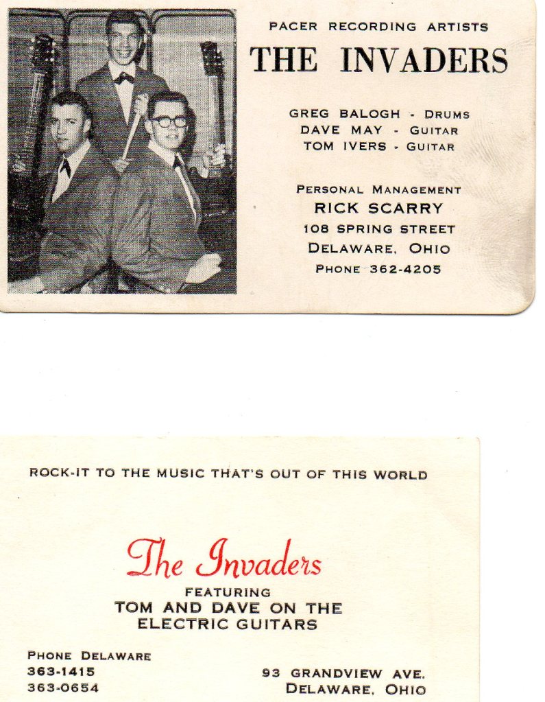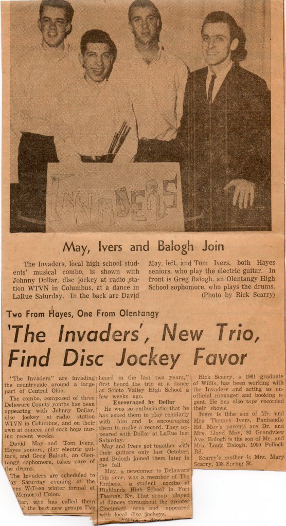 May now lives in Brentwood, Tennessee, but he grew up in Delaware, Ohio. He started the Invaders in fall of 1961 after meeting a new friend, Tom Ivers. They were both in high school. “We played as a duo for a time and used the name The Invaders, boasting ‘rock-it to the music that’s out of this world!’ After a few weeks our ambition grew and we found a drummer named Greg Balogh – at a different high school – and we became a trio doing instrumentals. We were the only band we knew about in the area and were invited to play at lots of local events and parties. We did have a few original compositions and decided we should make a record. Greg’s grandfather owned a local recreation area named Eckels Lake and he offered to underwrite our recording session.”