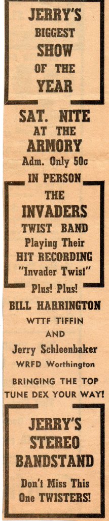 “We did our recording session at Coronet Records in Columbus and 500 copies were pressed at Columbia Records in Chicago. The records were placed in local record shops in central Ohio and in juke boxes. Local radio stations played it quite a bit in April, 1962 and we often joined disc jockeys at sock hops they hosted all over central Ohio. We were featured guest recording artists! Our band’s lifespan was fairly short, however, as I left town in the fall for college in Kentucky. We may have reconvened a time or two after that, but I never went back to Delaware once I was in college.