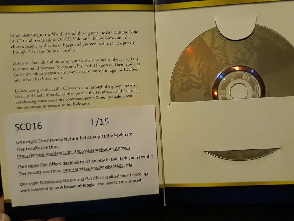 One of SP’s (less-graphic) Bible-themed releases; this one comes in a Bible audio book case. Consistency Nature And Flat Affect’s A Dream Of Alogia (SPCD16) (Source: Shaun Phelps)