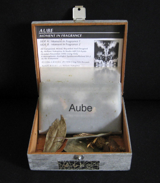 “Akifumi Nakajima (Aube) was very concerned about the packaging of his releases,” Maes explains. “He loved out-of-the-box ideas and was fascinated by special covers. That’s how we could convince him to release a tape on Cling Film. We were inspired by the title of the release ‘moment in fragrance’ and created a package that had various odors. The smell of a wooden cigar box filled with dried leaves contributed to the listening experience.