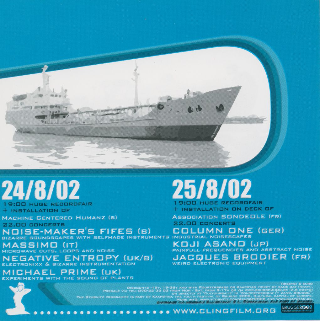 Perhaps the most bizarre event came a year later, when they staged several activities as part of Bruges’ Bruges 2002 events. “Part of Bruges 2002 was a two-day festival on the Stubnitz boat,” Maes recalls. “Noise-Maker’s Fifes, Massimo, Machine Centered Humanz, Column One, Koji Asano and Jacques Brodier performed. Jacques Brodier couldn’t stop playing. He was in some sort of trance and we made all sort of gestures to attract his attention. The performance by Column One was genius but weird. A performer was sitting on his knees, dressed as a little girl. He wore a mask. Other members of Column one handed out mashed potatoes to the audience. The potatoes were thrown in the face of the ‘little girl’.”
